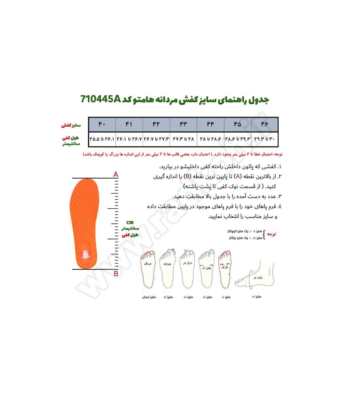 جدول راهنمای سایز صندل مردانه هامتو مدل 710445A-13