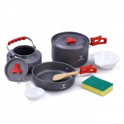 - محتویات بسته: قابلمه، ماهیتابه، کتری، قاشق چوبی، ملاقه، اسکاج، ۳ کاسه پلاستیکی و کیسه توری مخصوص حمل