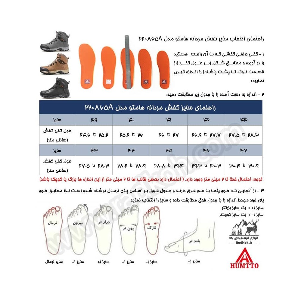 کفش کوهنوردی و طبیعت گردی مردانه و پسرانه هامتو مدل humtto 220865A کفشی ساقدار می باشد که به خوبی مچ پاها را در برمی گیرد و مانع پیج خوردن پا می شود. هامتو در تولید رویه این مدل، از چرم استفاده کرده که دوام و استحکام بسیار بالایی دارد. زیره کفش نیز از دو لایه لاستیک و EVA تشکیل شده است. ساختار زیره به گونه ای می باشد که برای مسیرهای کوهنوردی سبک، طبیعت گردی، ترکینگ، جنگل نوردی کاربرد دارد همچنین برای کارهای ساختمانی، کارگاهی هم می تواند انتخابی عالی باشد. شایان ذکر است طی مراجعات حضوری و تماس های تلفنی که داشتیم برای بسیاری از افراد سوال هست که کفش هامتو مدل 220865A برای استفاده روزمره کاربرد دارد؟ کفش هامتو مدل 220865A از جمله کفش هایی به شمار می آید که علاوه بر استفاده در کوه، کویر و جنگل، برای استفاده روزمره نیز کاربرد دارد. این مدل کفش هامتو با توجه به وزن بسیار کم، رویه ضد آب، زیره منعطف و راحت، بیشترین استفاده را در فصل های سرد سال (پاییز و زمستان) دارد.