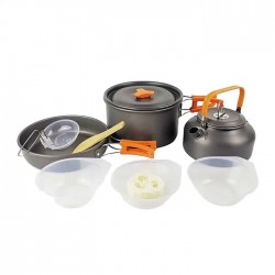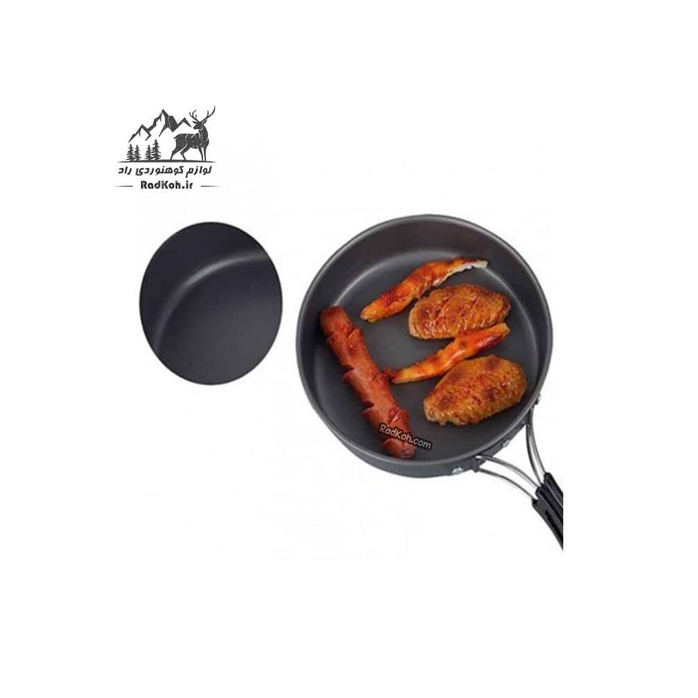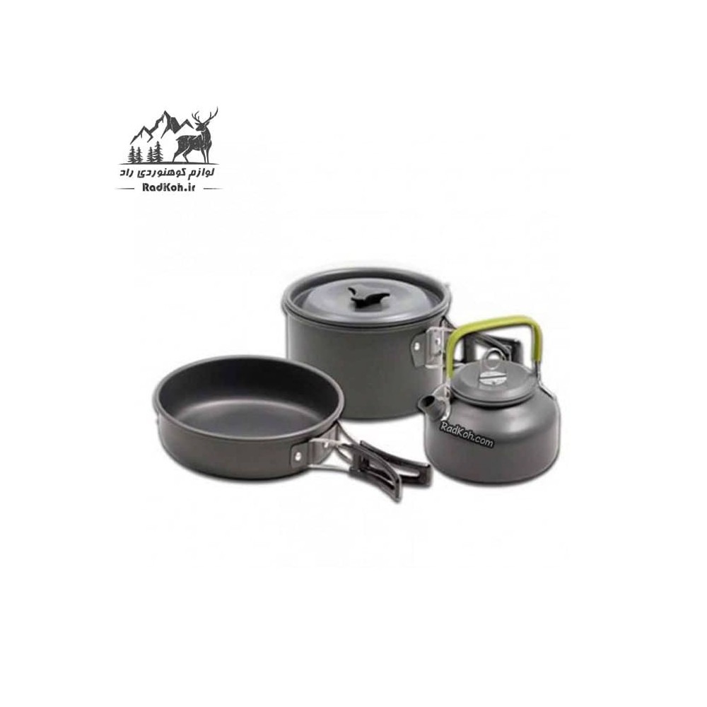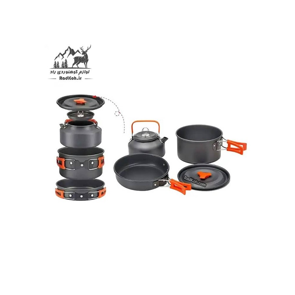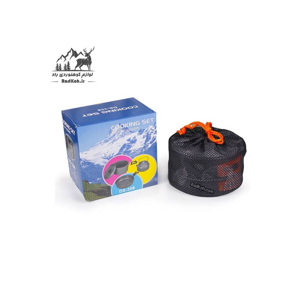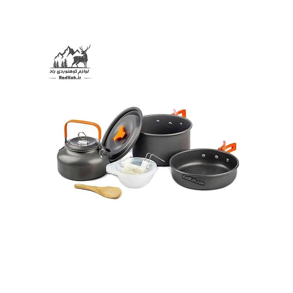 1 عدد ماهیتابه، 1 عدد کتری درب دار، 1 عدد قابلمه درب دار، 1 عدد قاشق چوبی، 3 عدد پیاله، 1 عدد ملاقه پلاستیکی، 1 عدد اسکاچ