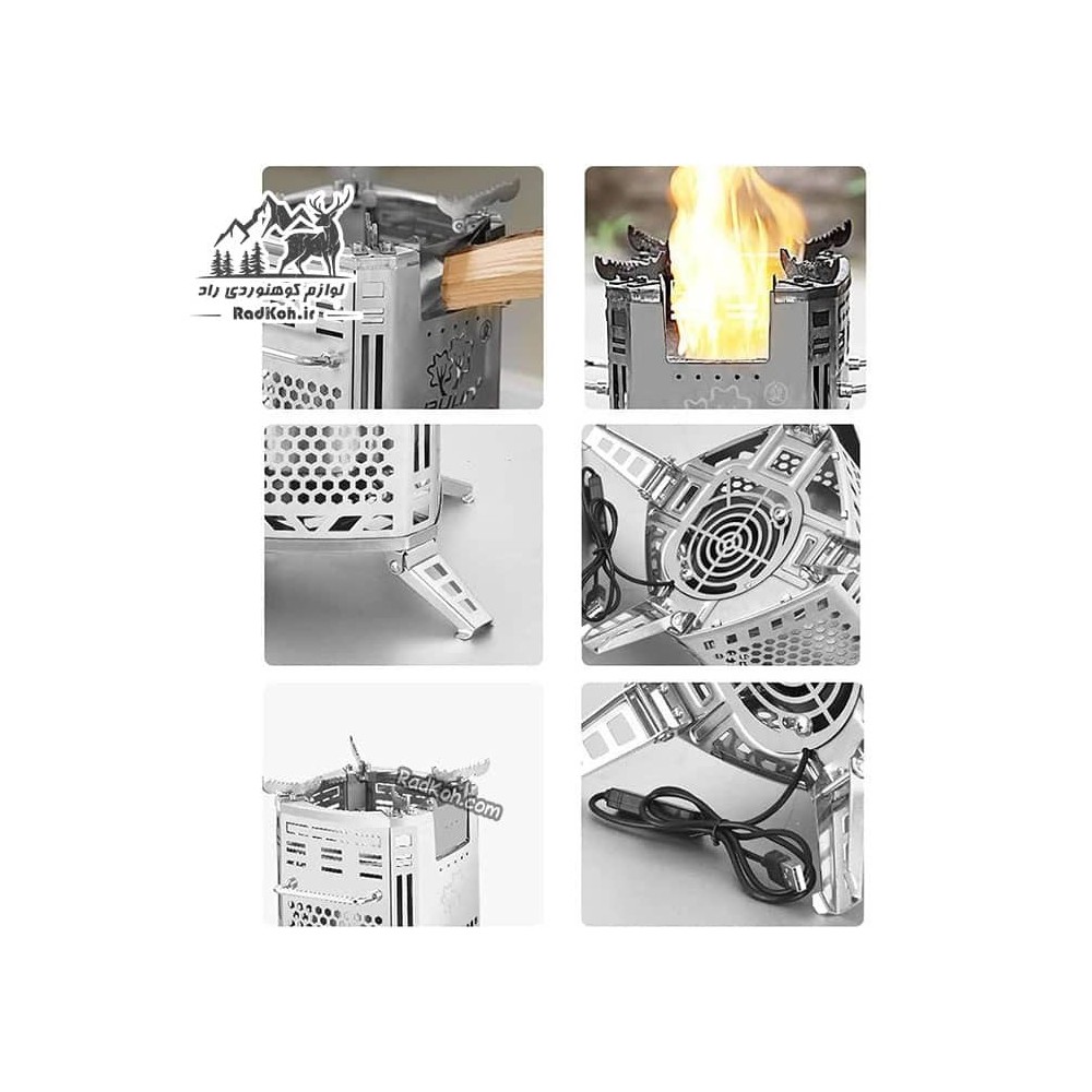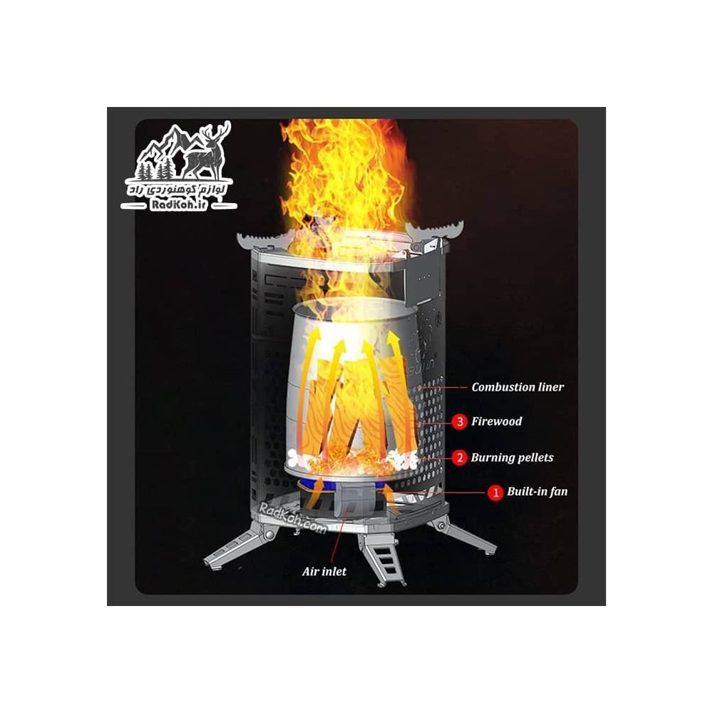ورود هوا از سوراخ های دور بدنه به محفظه داخل باعث می شود با دود کمتری چوب بسوزد، دارای فن در زیره اجاق با تنظیم سه حالته برای قدرت آتش، حداکثر وزن تحمل: 50 کیلو گرم